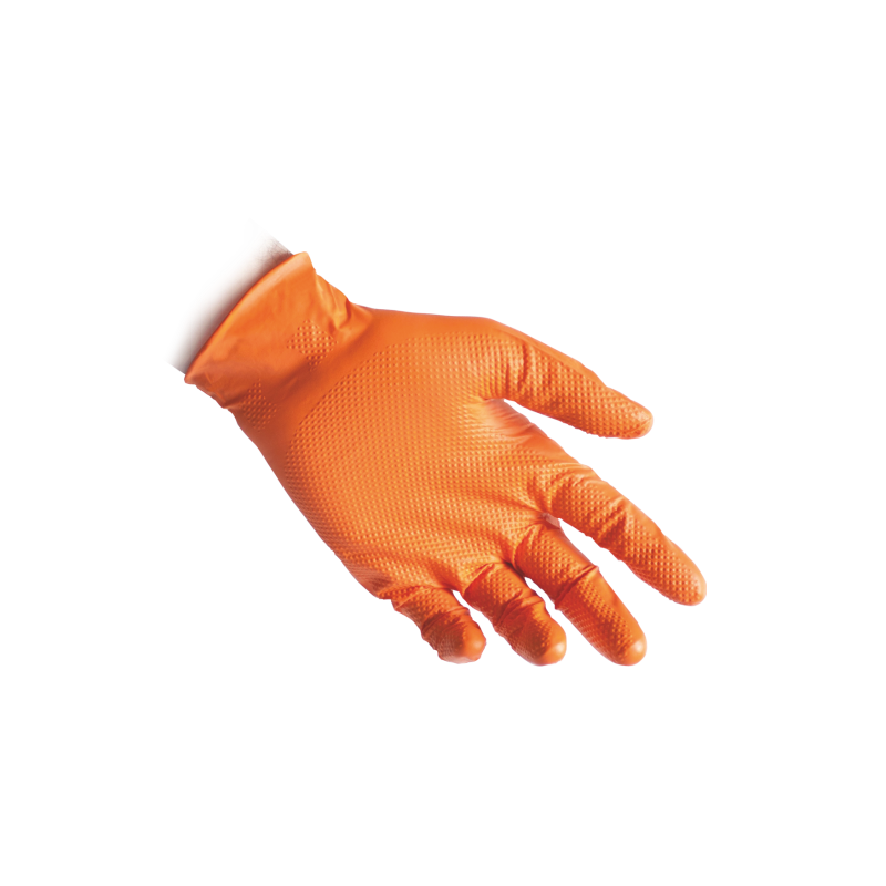 Одноразовые перчатки, универсальные (подходят для обеих рук) и на 100% не содержащие латекса, разработаны для интенсивного использования в сложных условиях. Специальная 3D-текстура, покрывающая всю ладонь и пальцы, обеспечивает максимальное сцепление (FULL GRIP). Высокая прочность (HEAVY DUTY) делает их идеальными для работы в механике и автомобильной промышленности. Оранжевый цвет гарантирует высокую видимость, что облегчает работу в условиях слабого освещения и позволяет менеджерам по безопасности проще контролировать использование средств индивидуальной защиты. Эти перчатки являются средствами индивидуальной защиты (СИЗ) категории 3, также подходят для защиты от химических веществ и микроорганизмов в соответствии с Регламентом ЕС 2016/425. Имеют сертификаты EN ISO 374-1:2016 / ТИП B (защита от четырех химических веществ) и EN ISO 374-5:2016 (защита от бактерий и грибков). Перчатки также подходят для контакта с различными видами продуктов питания в соответствии с Директивой 2002/72/EEC, Регламентом ЕС 10/2011 и их обновлениями. Подробная информация представлена в декларации о контакте с продуктами. Отсутствие пудры минимизирует риск раздражения кожи и загрязнений.
